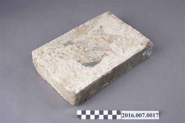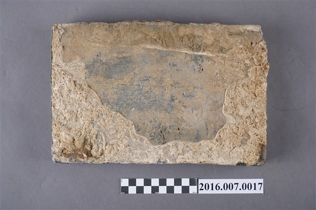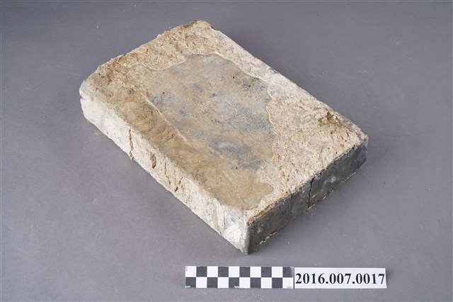 1.本件烏磚,為青灰色甓磚,原位於善化陳宅第二落步口廊臺基邊緣的砛墘,於104年11月12日拆解取得。尺寸為26.5X17.5X5公分,較一般條磚大,以直立條狀組砌,作為高落差臺階的地坪,左右寬面留有灰泥,面朝外之窄面中央有一道裂痕。烏磚係以還原法燒製,與紅磚以氧化法燒製不同,磚色呈青灰色,在臺灣傳統民居多作為點綴,較少大量使用,推測本件可能為來自中國大陸的建材。目前烏磚因還原法技術失傳,臺灣已無法生產。