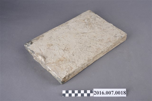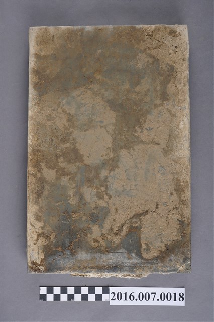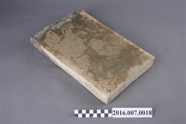 1.本件烏磚,為青灰色甓磚,原位於善化陳宅第二落步口廊臺基,於104年11月12日拆解取得。尺寸為34.5X22X3.5公分,較一般條磚大,平放組砌,作為臺基,上下寬面留有泥土,面朝外之立面有灰泥。烏磚係以還原法燒製,與紅磚以氧化法燒製不同,磚色呈青灰色,在臺灣傳統民居多作為點綴,較少大量使用,推測本件可能為來自中國大陸的建材。目前烏磚因還原法技術失傳,臺灣已無法生產。