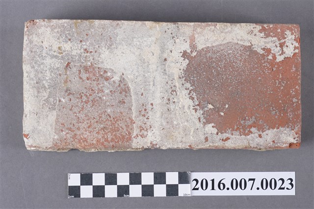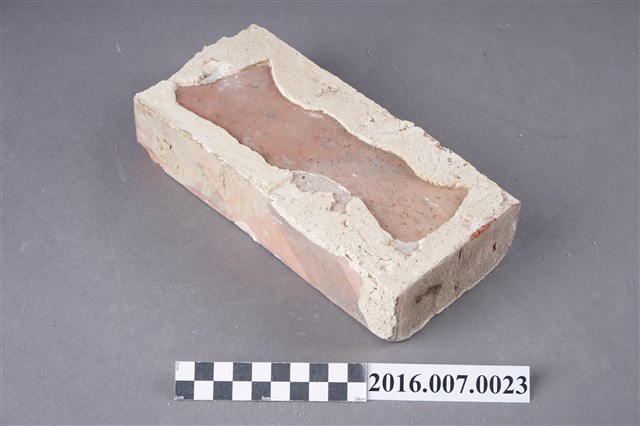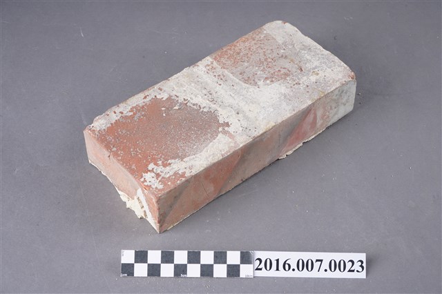1.本件燕尾磚,尺寸為21.6X10.1X4.5公分,屬條磚,原位於善化陳宅第二落小邊牆面,於104年12月3日取得,連接下方的一面保留有接縫完整的灰泥。燕尾磚,又稱為顏只磚、燕子磚、雁子磚、岸只磚,長側面有1-2道黑色斜紋為其特徵,是入窯磚坯交錯疊放與松木等燃料灰的油脂留在磚面上所形成。因交錯疊放的斜紋形似燕尾而稱之,質地細緻而精美,通常使用於傳統民居明顯部位牆面。