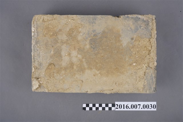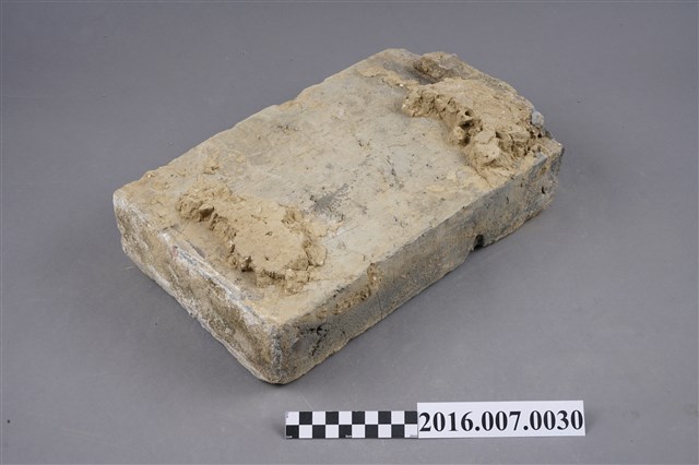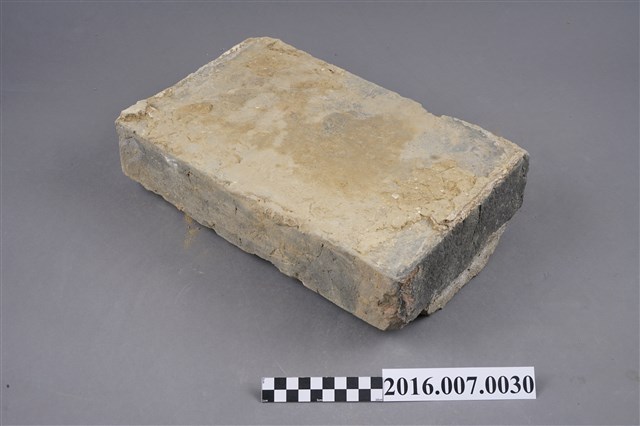 1.本件烏磚,為青灰色甓磚,原使用於善化陳宅第二落小邊牆基卵石砌牆上方,作為卵石砌牆與甓磚斗砌牆銜接的過渡線條裝飾,於104年12月3日取得。尺寸為35X22X7公分,較一般條磚大而厚,連接上方的一面留有泥土。烏磚係以還原法燒製,與紅磚以氧化法燒製不同,磚色呈青灰色,在臺灣傳統民居多作為點綴,較少大量使用,推測本件可能為來自中國大陸的建材。目前烏磚因還原法技術失傳,臺灣已無法生產。