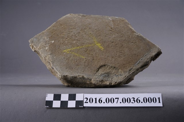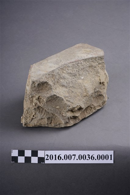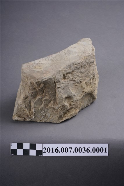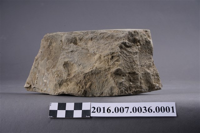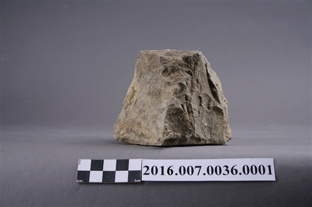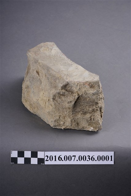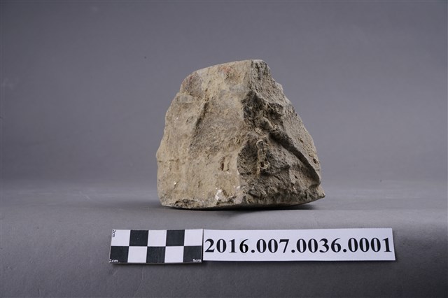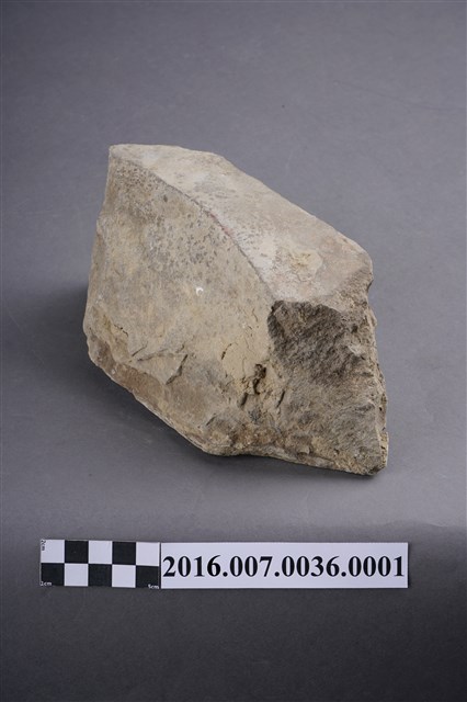 1.本件卵石,六角形,用於善化陳宅第二落正身步口廊虎邊(小邊)廊牆牆基的卵石砌牆組上排,作為花瓣,於104年12月3日拆解取得。卵石平整面朝外,表面有一圏墨線灰縫痕跡,圓錐面朝內,石塊厚度約9公分。