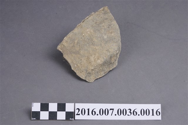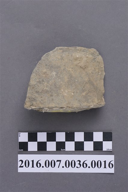 1.本件卵石,三角形,用於善化陳宅第二落正身步口廊虎邊(小邊)廊牆牆基的卵石砌牆組下排中央、二朵四瓣花之間,於104年12月3日拆解取得。卵石平整面朝外,圓錐面朝內,留有疊砌填充時旳部分泥土。