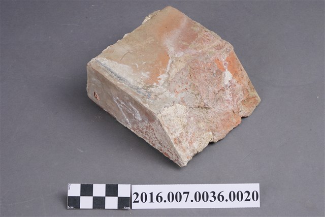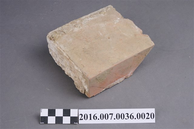 1.本件燕尾磚,厚約4公分,短邊一面斜切,長度約切短一半,用於步口廊卵石砌牆右側邊框裝飾條,表面與四周留有灰泥。燕尾磚,又稱為顏只磚、燕子磚、雁子磚、岸只磚,長側面有1-2道黑色斜紋為其特徵,是入窯磚坯交錯疊放與松木等燃料灰的油脂留在磚面上所形成。因交錯疊放的斜紋形似燕尾而稱之,質地細緻而精美,通常使用於傳統民居明顯部位牆面。