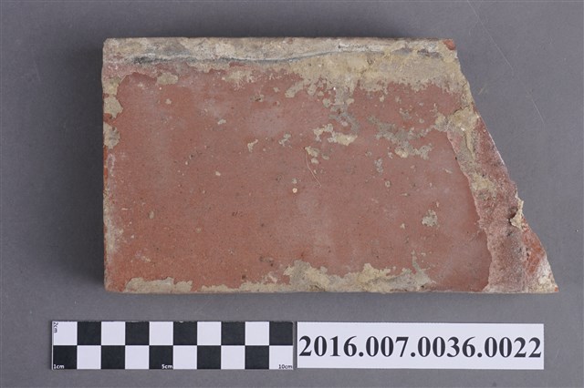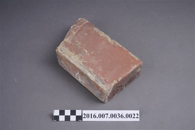 1.本件燕尾磚,厚約4公分,短邊一面平切,長度大於一半,用於步口廊卵石砌牆上側邊框裝飾條,朝內五面留有部分泥土。本件與下一件原為同一塊磚,後於拆解時斷裂成二塊。燕尾磚,又稱為顏只磚、燕子磚、雁子磚、岸只磚,長側面有1-2道黑色斜紋為其特徵,是入窯磚坯交錯疊放與松木等燃料灰的油脂留在磚面上所形成。因交錯疊放的斜紋形似燕尾而稱之,質地細緻而精美,通常使用於傳統民居明顯部位牆面。