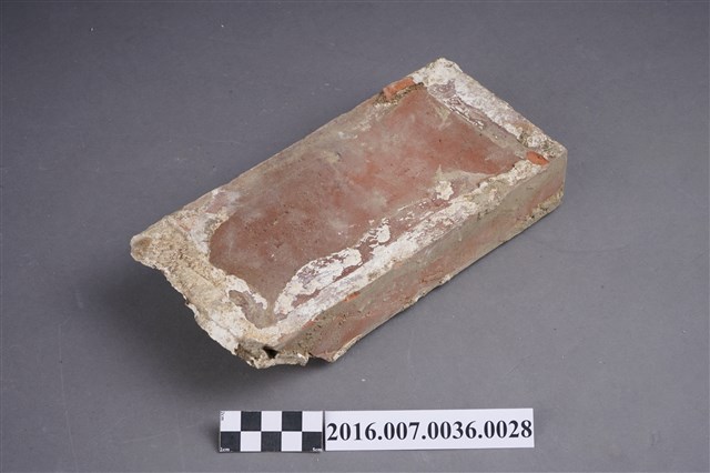 1.本件燕尾磚,厚約4公分,短邊一面斜切,用於步口廊卵石砌牆左下角邊框裝飾條,因接近地坪受潮,表面有青苔、白化,靠斜切口處受損,朝內五面則留有部分泥土及灰泥。燕尾磚,又稱為顏只磚、燕子磚、雁子磚、岸只磚,長側面有1-2道黑色斜紋為其特徵,是入窯磚坯交錯疊放與松木等燃料灰的油脂留在磚面上所形成。因交錯疊放的斜紋形似燕尾而稱之,質地細緻而精美,通常使用於傳統民居明顯部位牆面。