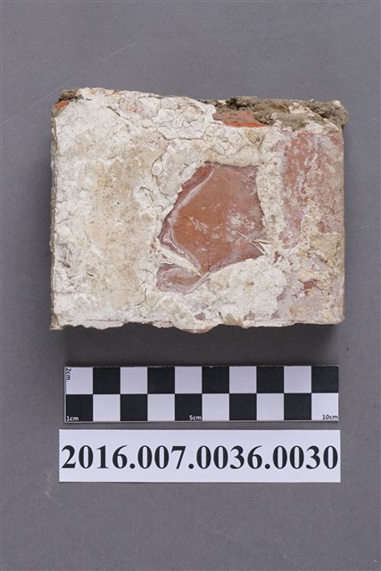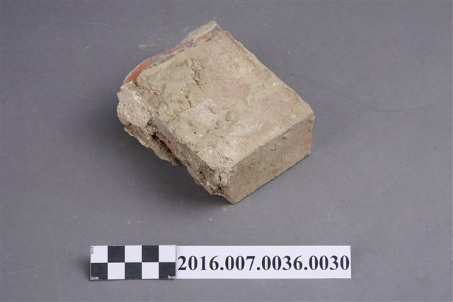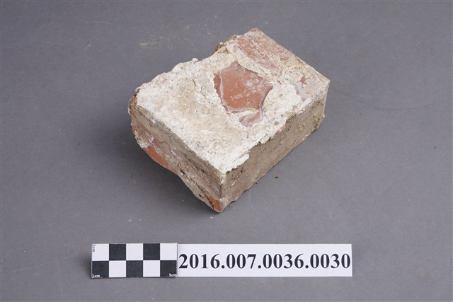 1.本件燕尾磚,厚約4公分,短邊二面平切,長度小於一半,用於步口廊卵石砌牆下側邊框裝飾條,頂部留有一層灰泥,底部則有部分泥土。燕尾磚,又稱為顏只磚、燕子磚、雁子磚、岸只磚,長側面有1-2道黑色斜紋為其特徵,是入窯磚坯交錯疊放與松木等燃料灰的油脂留在磚面上所形成。因交錯疊放的斜紋形似燕尾而稱之,質地細緻而精美,通常使用於傳統民居明顯部位牆面。