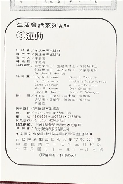 李載濤主編,《美語世界實況會話:生活會話系列A組 3運動》(台北:美語世界出版社,1878),頁5-6。