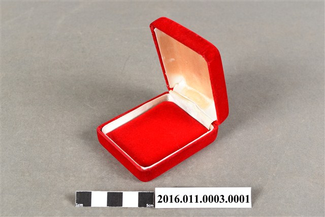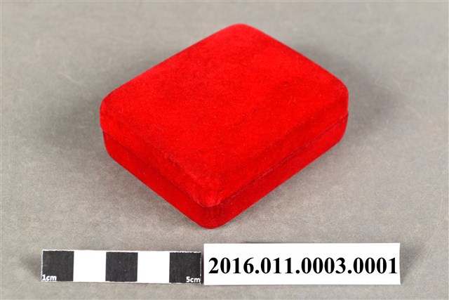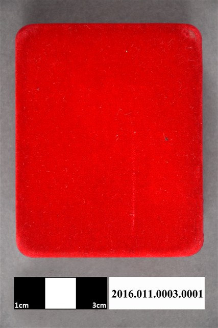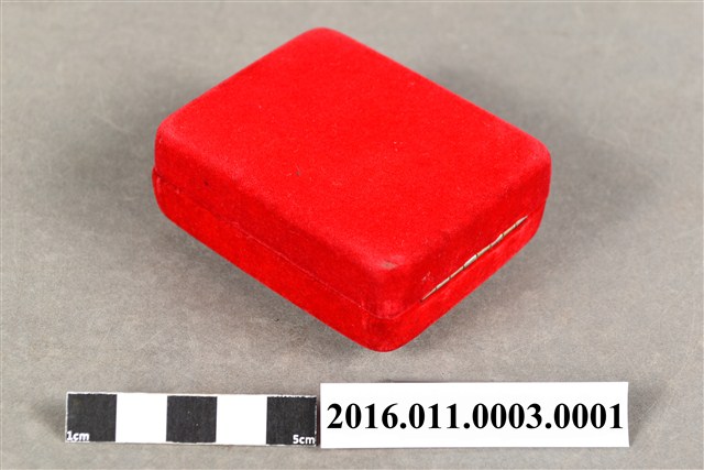 金質紀念章置於紅色絨布盒子中,然未加固定,可直接取出紀念章。