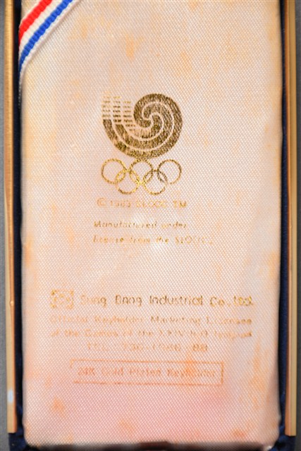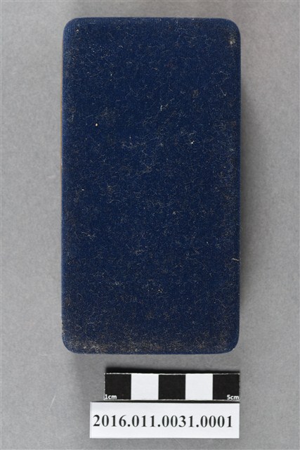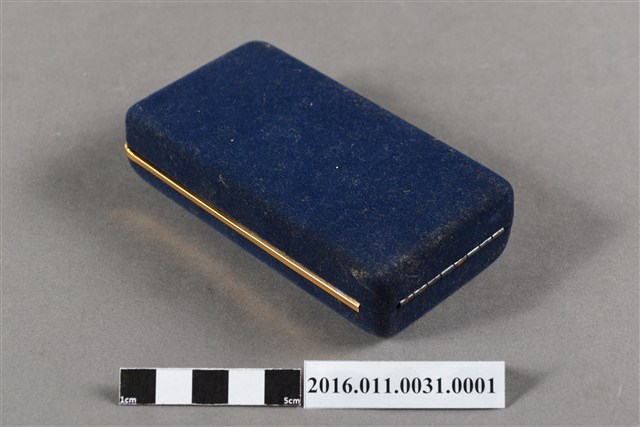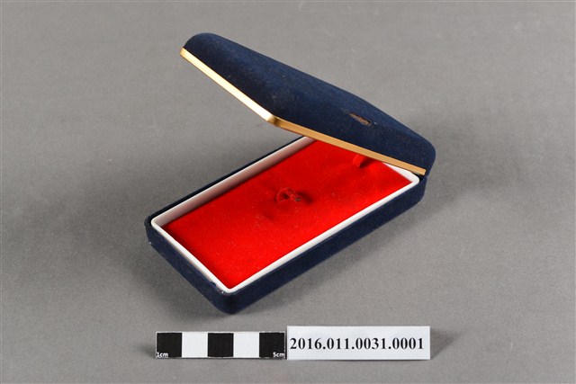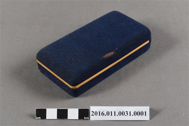 1. 本件絨布盒為1988漢城奧運紀念鑰匙圈與收藏盒部件之一,呈長方形,以鉸鍊相接,上下開闔,表面以藍色絨布包裹,上蓋邊緣絨布略微破損,蓋沿鑲一圈金邊。上蓋內裡白布上燙金1988年漢城奧運標誌及奧運五環圖樣,下方為製造商及商品資訊,標示此鑰匙圈由24K金打造,為第二十四屆奧林匹克運動會商品。下盒內側周圍環繞一圈白邊,內裡鋪有紅布,並有條狀凸起,用以固定鑰匙圈。2. 1988漢城奧運是於1988年9月17日至10月2日,在韓國首都漢城(現名首爾)舉行的夏季奧林匹克運動會,這是奧運史上繼1964年東京奧運會後,第二次由亞洲國家舉辦之奧運會, 兩年前1986年第十屆亞洲運動會的主辦權也由漢城奪得。