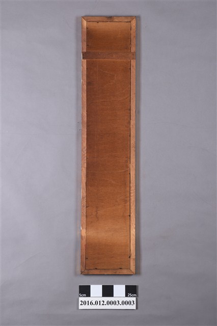 本組觀音媽聯形式較為繁複,除了中央的家堂四神圖外,上方為太上老君與八仙圖,左右則是四片字聯的形式,本件為內聯之上聯,紫竹林中觀自在。