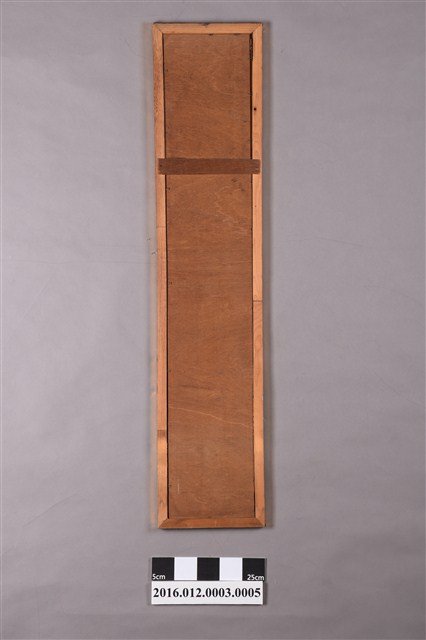 本組觀音媽聯形式較為繁複,除了中央的家堂四神圖外,上方為太上老君與八仙圖,左右則是四片字聯的形式,本件為外聯之上聯,佛力永扶家安宅吉。