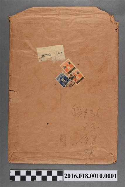 銓敘部紙袋,背後貼有三張郵票(鄭成功像),票額分別為一圓、0.2圓、0.2圓。