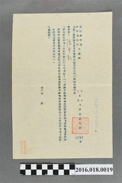 2016.018.0019 陳重松臺灣農林股份有限公司水產部公文44.4.21農營水總字第0209號