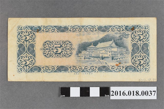 2016.018.0037 臺灣銀行發行臺幣伍圓紙鈔