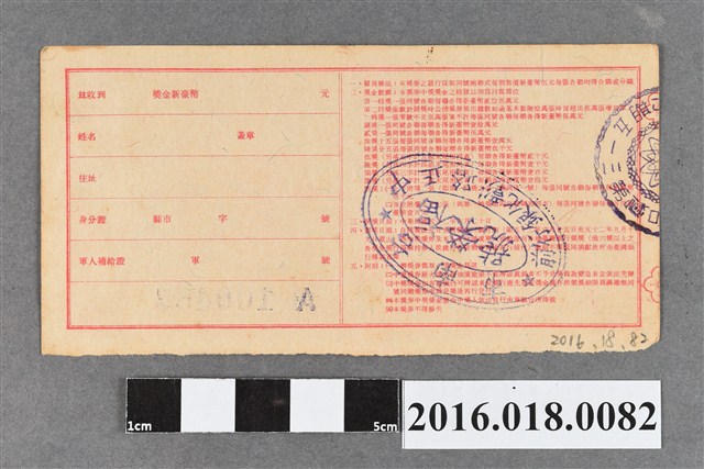 橫式設計,紅色紋框,由右至左,刊頭雙百合花,下圓框內「2甲‧聯」,刊尾長卷葉,「第315期」,「愛國獎券」,下列編號「A 100467」底飾「愛國致富」浮水印,往左圓形開光內「岳飛 精忠報國」圖樣,圖左上「新臺幣伍圓」,圖左「保密防諜、人人有責」,「中華民國五十二年六月二十日開獎」置下方。 背面蓋有臺南市、福榮號、中正路彰化銀行前。