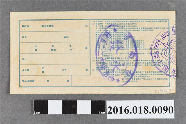 基本發行張數為六十萬張,橫式設計下飾如意紋,由右至左「中華民國五十五年十一月廿五日開獎」,「新臺幣伍圓」,回紋花框內「第429期」,「甲聯」,左「漢 玉辟邪」圖,左上列「愛國獎券」,左框「臺灣省政府委託臺灣銀行發行」,下框編號「A085656」。 背後蓋有臺南市、永發、西市場內225號。