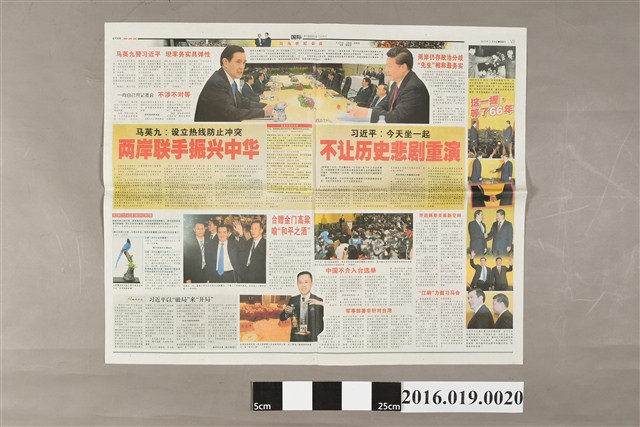 2015年11月8日南洋商報V2和V3版對馬習會之全版報導,標題為「兩岸聯手振興中華 不讓歷史悲劇重演」。V4版對馬習會之全版相關報導,標題為「習馬會"會外戰" 兩岸媒體搶位大戰」。
