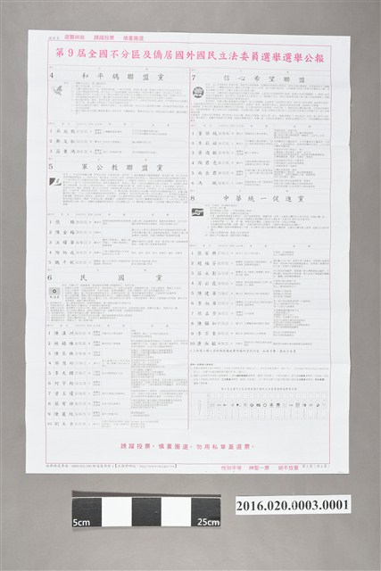 該物件為國立臺灣歷史博物館副館長郭碧娥女士所捐贈之民國105年(2016年)第九屆新北市全國不分區及僑居國外國民立法委員選舉公報。該份公報由新北市選舉委員會所印發,共2頁,明列18個政黨及其不分區候選人資料。 第一頁所列的8個政黨為民主進步黨、親民黨、自由臺灣黨、和平鴿聯盟、軍公教聯盟黨、民國黨、信心希望聯盟、中華統一促進黨。