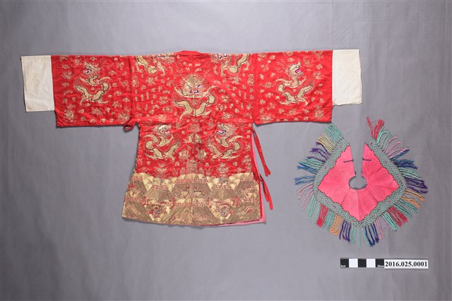 1. 本件據捐贈者描述,為其外祖母陳王杏女士(1899-1997,高雄岡山人),約22-23歲左右嫁到夫家陳家時所穿之新娘禮服,包括禮服上衣長衫與霞帔共1組2件。據捐贈者表示本件應為高雄岡山地區訂製禮服,從服飾刺繡、縫紉手法判斷為手工縫製,由所有者年齡推測結婚時間為日治大正年間(約1920年左右)之傳統新娘禮服。