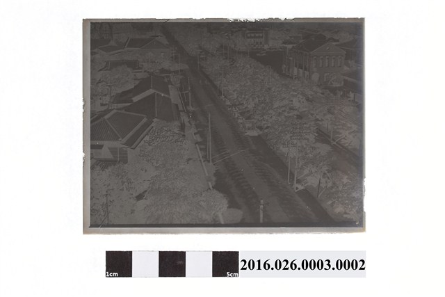 此底片為北浦義三翻拍自《臺灣寫真大觀》,根據本館助理研究員張淑卿考證認為該照片集是1933-1937年間出版。推測為北浦自1932年由臺東回日本後,透過管道取得該寫真集,進行翻拍。(以上為陳怡宏撰文)1.《臺灣寫真大觀》編號13之黑白照片,影像內容為臺北市近代都市規劃下的北三線道路(今忠孝西路),由西往東望,整齊的街道,種有行道樹,遠處可見臺北酒廠的幾根大煙囪。