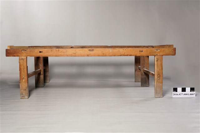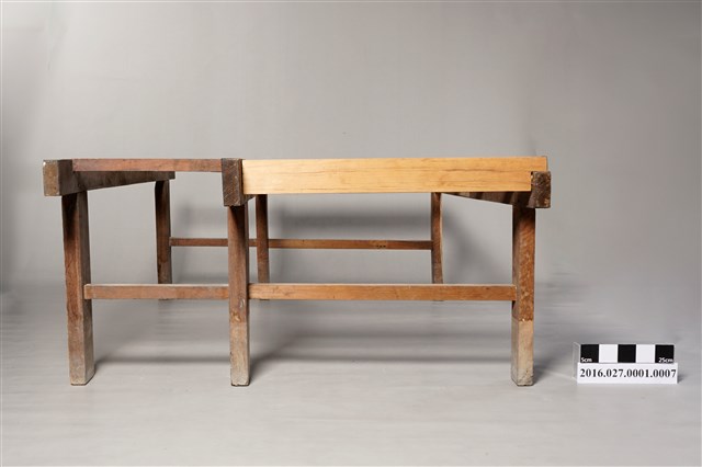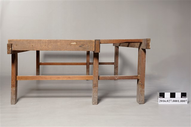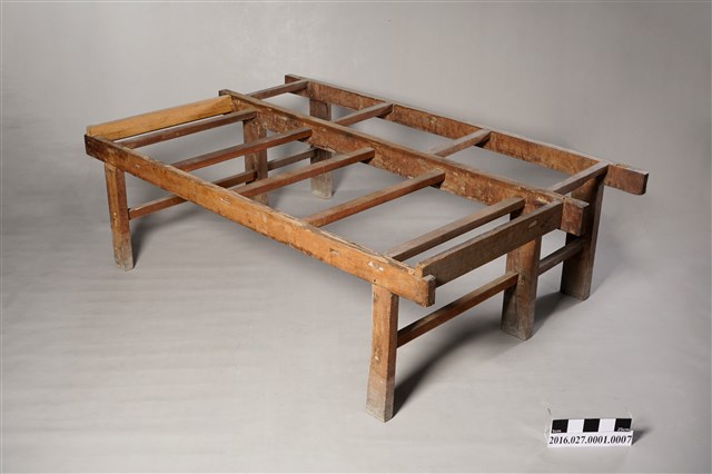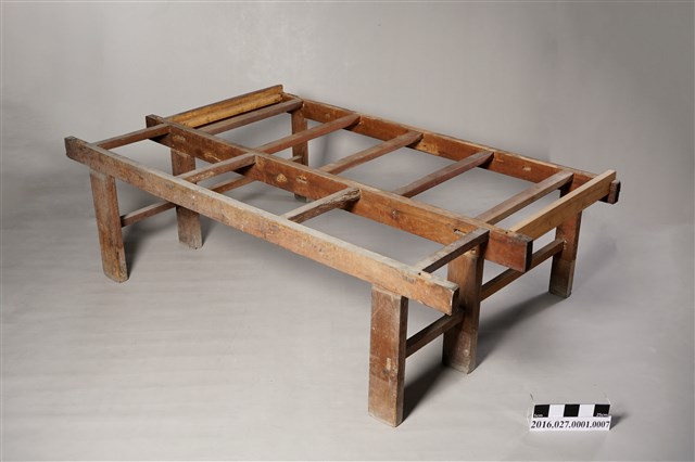 1. 根據捐贈者描述,本件紅眠床為捐贈者父親柯全鏞(1906-1998,南投埔里人)與第一任妻子陳灶(1911-1939,台南人,婚後改名柯陳雪峰)約1930年左右結婚時,祖父特地到彰化鹿港訂製,再用牛車經水里運回南投埔里,據說當時價值約值2分地。陳灶為留日女醫師,不習慣睡中式紅眠床,後來柯全鏞的大哥娶妾時,此紅眠床便借給大哥使用。此床於大哥過世後,被柯全鏞要回,據說紅眠床原附有腳踏椅,但取回時已遺失。