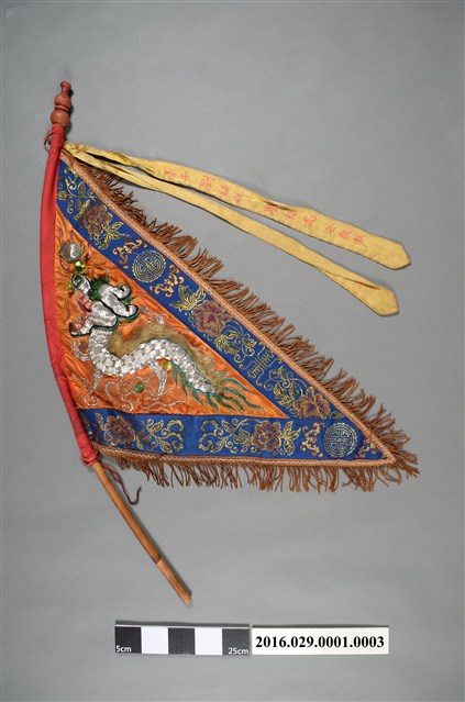 2.五方旗,又稱五營旗、五峰旗、五色令旗,是五營兵馬的代表物,青、白、紅、黑、黃色等五色代表東、西、南、北、中的五個方位。旗身成三角型,旗骨以藤為骨架,旗頭配以車軹木製葫蘆,上漆紅色,葫蘆頭下綁有2條黃色劍帶,上書使用年份與敬獻者名「歲次癸酉年菊月吉旦」、「弟子劉福旺、劉福志全敬獻」。旗身底布採素面橘色繡地,雙面繡有單龍吐珠,配以亮片,繡邊為藍底現成織布,上有壽字、蝙蝠、牡丹花等吉祥圖案,周圍以流蘇裝飾。繡心的龍身是以舖棉浮紮,再以11條銀蔥線為一束,手工縫製而成,龍爪為四爪,龍背飾有兔毛。