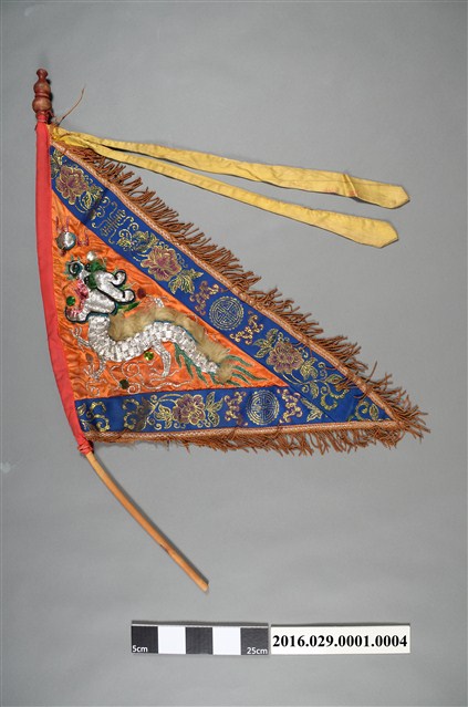 2.五方旗,又稱五營旗、五峰旗、五色令旗,是五營兵馬的代表物,青、白、紅、黑、黃色等五色代表東、西、南、北、中的五個方位。旗身成三角型,旗骨以藤為骨架,旗頭配以車軹木製葫蘆,上漆紅色,葫蘆頭下綁有2條黃色劍帶,上書使用年份與敬獻者名「歲次癸酉年菊月吉旦」、「弟子劉福旺、劉福志全敬獻」。旗身底布採素面橘色繡地,雙面繡有單龍吐珠,配以亮片,繡邊為藍底現成織布,上有壽字、蝙蝠、牡丹花等吉祥圖案,周圍以流蘇裝飾。繡心的龍身是以舖棉浮紮,再以11條銀蔥線為一束,手工縫製而成,龍爪為四爪,龍背飾有兔毛。