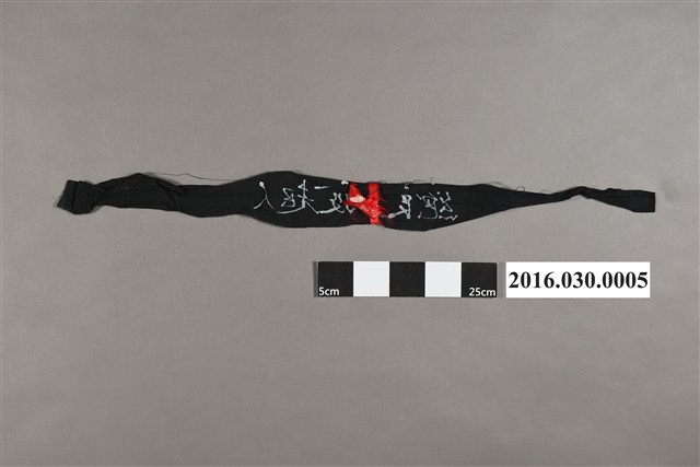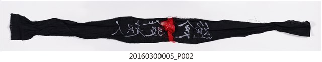 此為野百合運動時綁在頭上之黑色頭巾,頭巾上有文字「絕食發起人」,頭巾尾端附有紅絲帶。整付頭巾因時間久遠,不僅有皺痕,還有線頭被拉扯出現象。