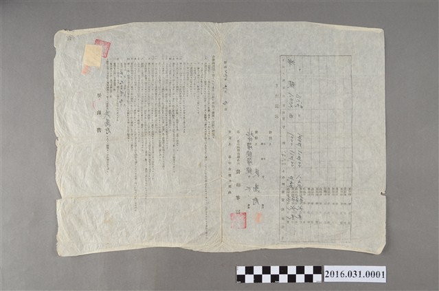 吳萬壽(1880-?,居住於臺中州北斗郡埤頭庄埤頭61番地,為捐贈者吳雪舫之祖父),於1938年向秋津村組合租借農地,位於埤頭之1377及479之4地番,地目為田,並需繳交佃租。借期為1938年1月1日至6月底,並需於3月9日繳交前期貸付料(租金)。文末之簽訂之借貸者是臺中市勸業課內之臺中州移住組合長佐治孝德。所謂秋津村為官營移民村,主要是利用濁水溪兩岸堤防工程完工後的廣大浮覆地(河川新生地),中部移民村分布在濁水溪南北兩岸的舊濁水溪流域與新虎尾溪流域,北岸原屬舊濁水溪流域的新生地,建設秋津村、豐里村、香取村、鹿島村、八洲村、利國村,南岸則原屬新虎尾溪流域的新生地,建設榮村及春日村。其中秋津村是昭和7年(1932),開始建設,其地理位置大概在當時的北斗郡沙山庄草湖(今日的彰化縣芳苑鄉文津村及新生村),主要是本籍九州人居多。移民村平均每戶分配面積4甲至5甲半。為何秋津村在埤頭有土地,則待查。