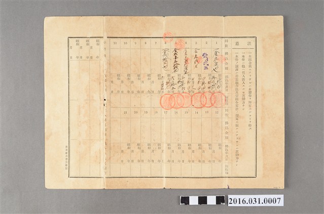 此為吳由地(1918年生,吳萬壽之子,捐贈者吳雪舫之父親)參加保證責任信用販賣購買利用組合之出資證券(一口)為30圓,組合長理事為吳在?,背面有他分六次於1939年3月2日至6月27日間繳納該出資上之金額,顯見當時農民加入相關信用組合,無法一次繳納,而需分次繳納之情形。