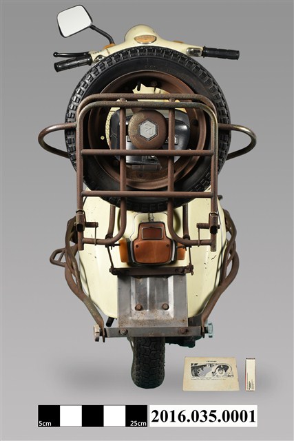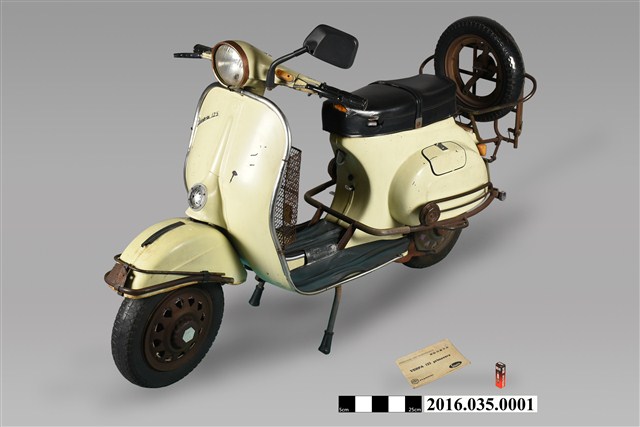 本物件為台灣偉士伯所生產之VESPA 125 primavera機車,年份約1973年時所生產,為侯東松醫生開設診所時所購買使用,外觀保存良好,含原車配件之維修工具,與駕駛保養手冊,而腳踏板之收納網架為自行安裝非原廠配件,餘原廠配件保存狀況良好。