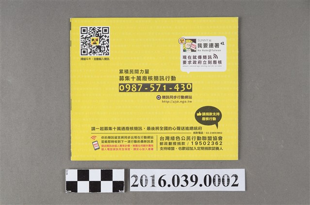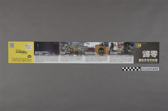 此為關於廢核四的宣傳單,共有6個折頁,封面標題是「歸零,重新思考零核電」。第一個折頁在講述臺灣的核電廠,因地理位置而被列為高危險群,若北台灣發生核災,疏散泛為人口密度也超高。第二折頁在講述核四之花費,40年運轉完畢共要花費8043億。第三折頁說明產生之燃料棒,找部到永久安全的儲存地。第四折頁說明這些燃料棒共7500噸,且人距離用過核燃料棒30公分部用幾秒就會死掉。第五折頁說明使用核電的比例,其實沒想像中這麼高,最後一個折頁說明臺灣的工業用電量是民生用電量的3倍。