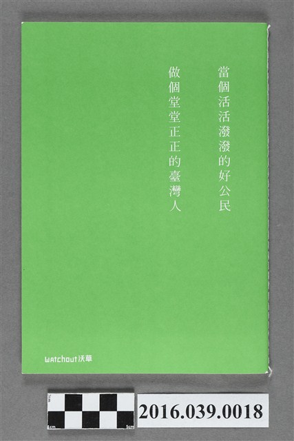 此為沃草發行的公民作業簿,整本作業部大約B5大小,仿照以往小學生的作業簿格式,不論圖像或是字體,皆為綠色。封面的標題為「公民作業簿」,中間有小孩與鸚鵡圖像,並有ㄧ些文字:「樂生、石虎、護樹、自經區、割闌尾」,最下方則有「公民小學、公民、組別」等文字,內頁是普通的空白紙,背面則有文字:「當個活活潑潑的好公民,坐個堂堂正正的臺灣人。」此本公民作業簿也是為草於募資平臺的贈禮之一,從正面的文字也可看出沃草關心的相關議題。「沃草」全名為「沃草有限公司」,其於2013年11月創辦,以社會企業的形態經營,標榜「亞洲第一個監督政府運作的獨立網路平台」,主要目的在於監督國會議員與其他民意代表、政府官員等政治人物,時常在網路上轉播立法院議場質詢實況。沃草的吉祥物名為阿草,主視覺為草泥馬,且「沃草」讀音易讓人聯想到臺灣的庶民草根飆罵用語,這些文字與圖像的聯結,強化了沃草的草根性與在地性,此種年輕、幽默的方式,深獲年輕人的喜愛。