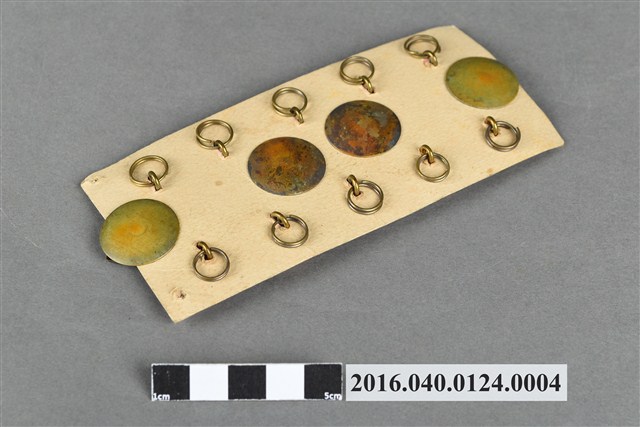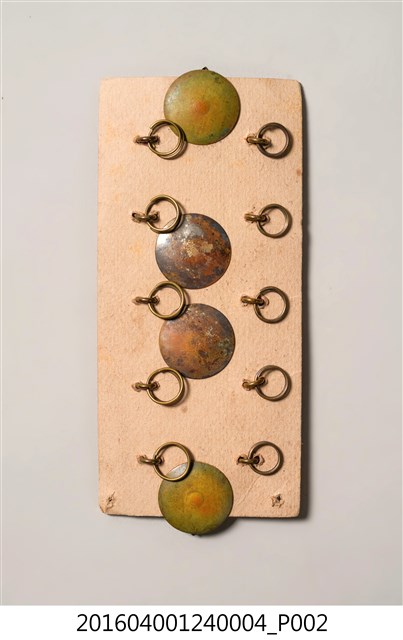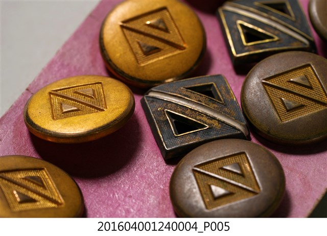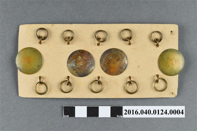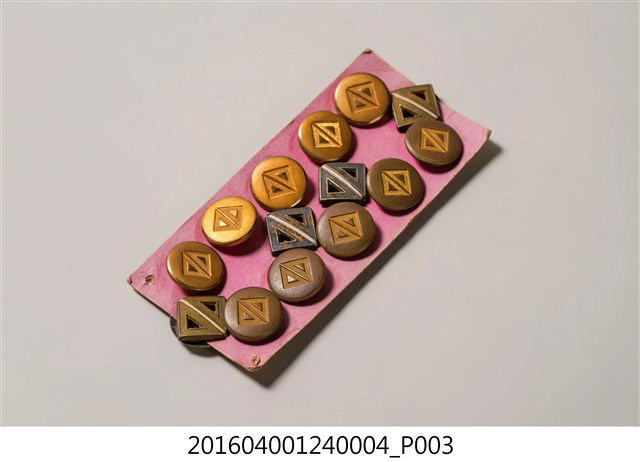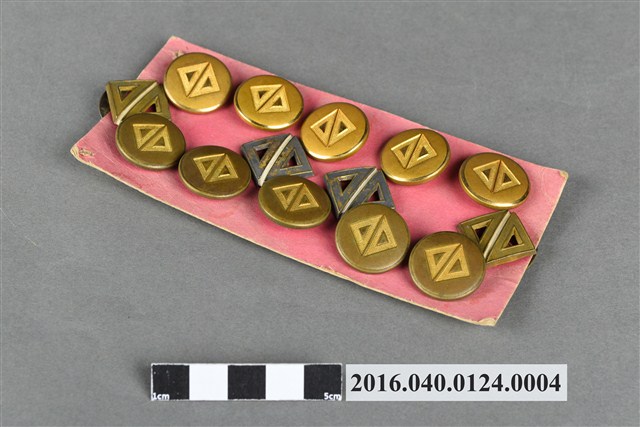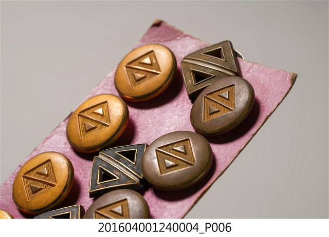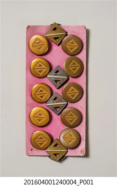 陳澄波文物。鈕扣10顆、袖章4顆,釘裝於紙板上成組。