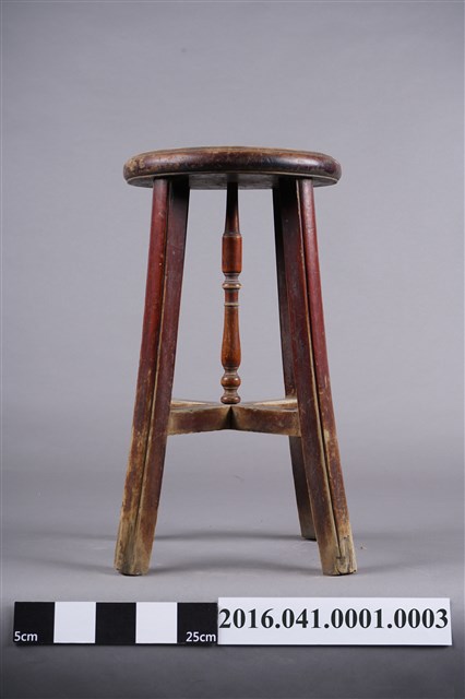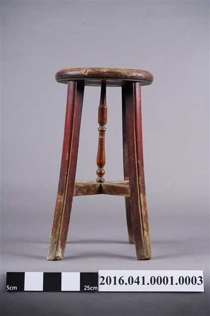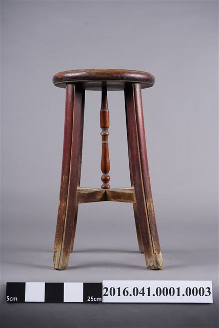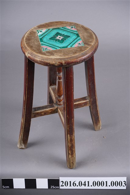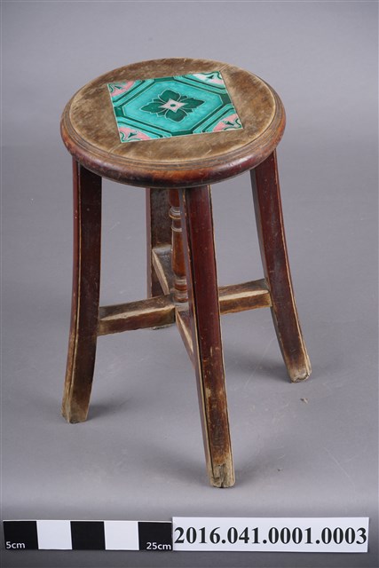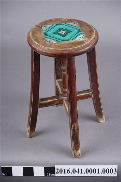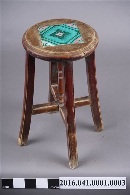 本件為搭配小圓桌的鑲彩色磁磚無靠背圓面高腳椅,通體施朱漆,椅高54.5cm,椅面呈圓形,直徑30m,中央鑲嵌一片綠色、粉紅色菱形花色磁磚(花色與0002相同,磁磚面完整無缺)。椅面下方有四支腳,支腳呈方角轉,由上而下略為外撇,最寬處為41cm,四腳中央有一車枳細柱與十字型高趕棖支撐,全件使用榫接,無使用鐵釘。