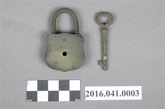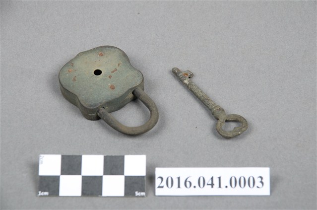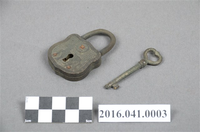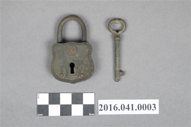 本組為捐贈者民權路老家早期所使用的西式銅鎖,用來鎖櫃子或箱子之用,包括鎖頭與鑰匙兩部分,共1組2件。銅鎖鎖頭為青銅材質,呈倒U型徽章狀,正面有圓形太陽(或月亮)及馬匹凸紋,中央有一鎖孔,背面中央亦有一小圓孔。銅鎖鑰匙為一字型凸鎖,鑰匙柄尾端為心型造型。