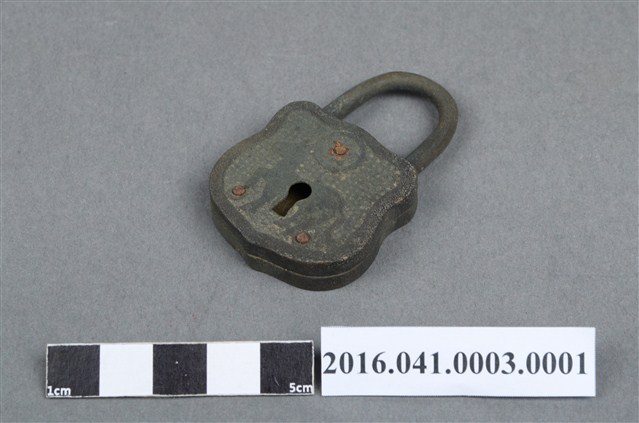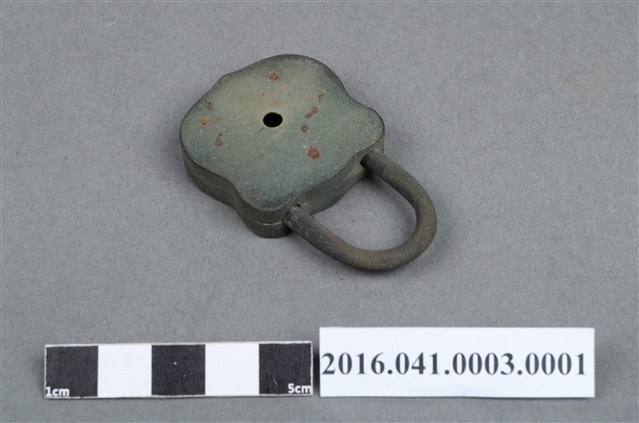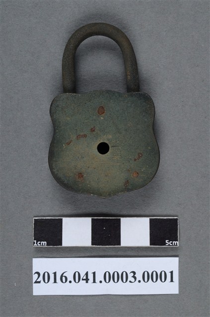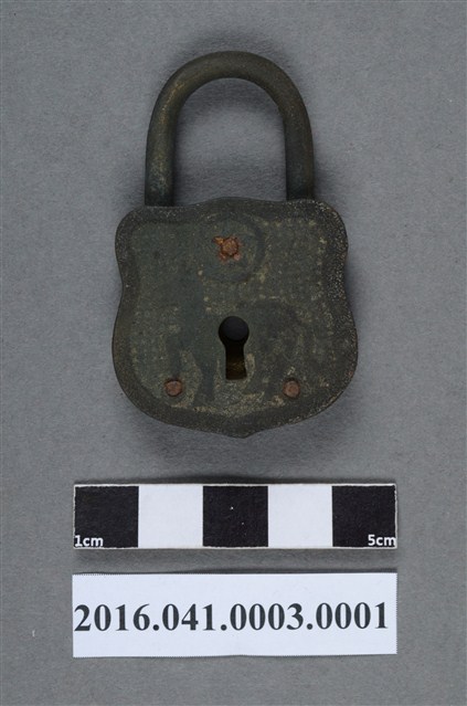 本件銅鎖為西洋鎖,鎖頭為青銅合金材質,呈倒U型徽章狀,正面有圓形太陽(或月亮)及馬匹凸紋,中央有一鎖孔,背面中央有一小圓孔。