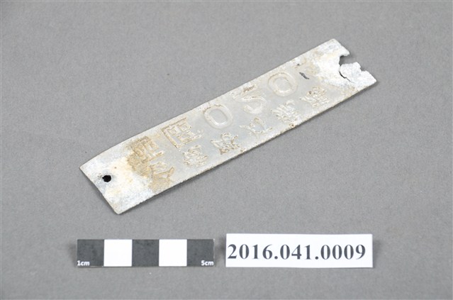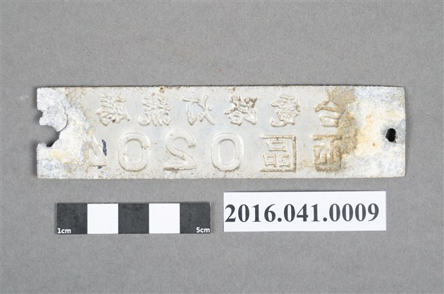 本件為捐贈者民權路3段老家後門的舊路燈號碼牌,原釘在後門門框上,因老家後門屬違建,捐贈者表示該只路燈早已不復存在,故拆除後門前取下。路燈號碼牌為鋁合金壓印而成,正面為藍底白色凸字:「臺電路燈號碼 西區 0204」,但因長年風化表面已斑駁不清,左右兩側邊各有1個小釘孔,背面無任何塗漆。
