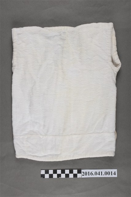 本件為捐贈者父親施克洲先生嬰幼兒時期所穿的小背心,捐贈者母親施黃錦女士以白色棉布手工縫製而成,背心無領、無袖,領沿、袖口、襟沿、及下襬皆內摺收邊。背心開右衽,以綁帶固定前襟於右胸處。