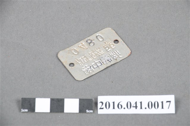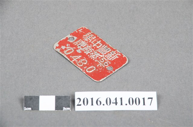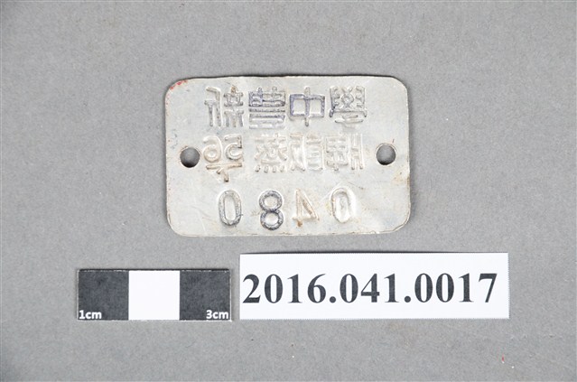 1. 本件為捐贈者父親施克洲先生就讀臺南新豐中學時的便當蒸飯牌,以鐵合金壓印之長方形牌,正面為紅色地金屬凸字「新豐中學 56下 蒸飯牌 0480」,左右兩側各有一小孔,可穿附線繩將鐵牌綁縛在便當外,供作辨識之用。