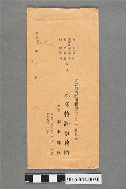 2016.044.0020 本多特許事務所寄田川清先生之信封
