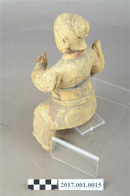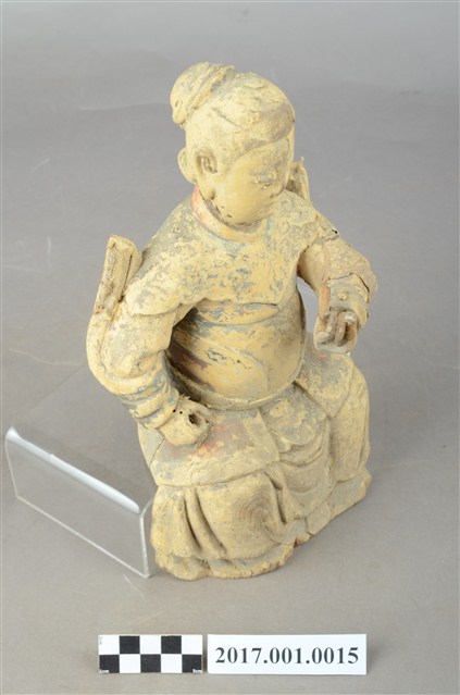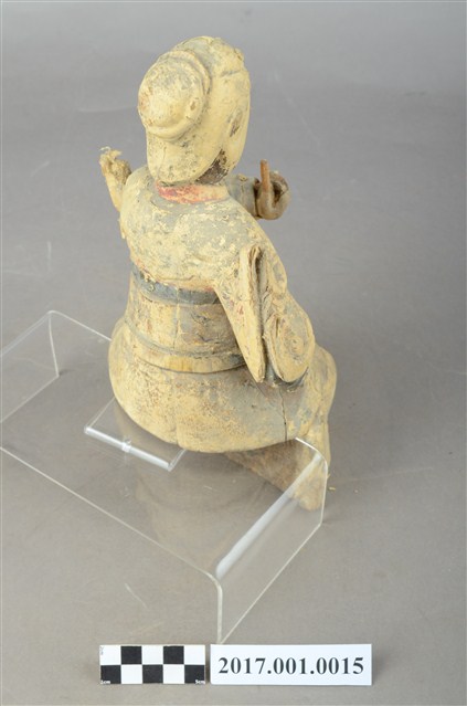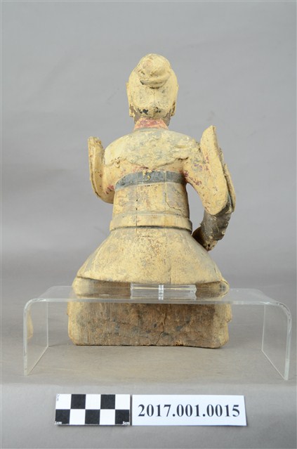 1.本件木雕九天玄女像,作坐姿姿態,粧佛已褪去,背部開有長方形入神洞,封榫尚存。顏面表現雙目半睜,上半身肩披雲肩,腰部繫腰帶固定護腹,寬袖的袖擺打結因擺動而向後揚起,下半身著裙。端坐,左手手指豎直,以拇指按中指與無名指,作道指訣,橫置於胸前,手指斷裂缺損,右手握拳持物置於右腿上,持物已失。本件屬於「脫椅」作法,臺座已失。