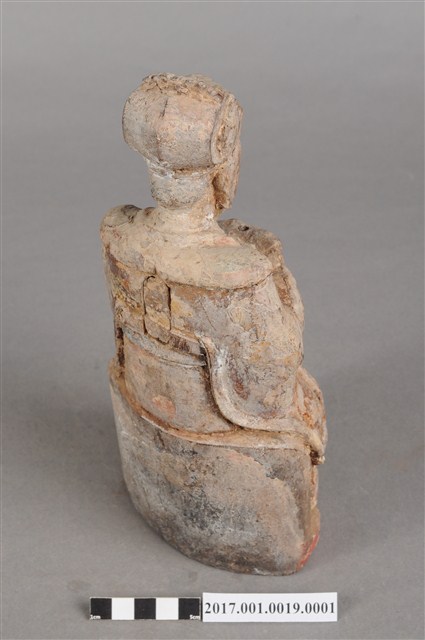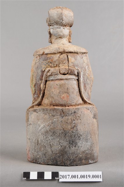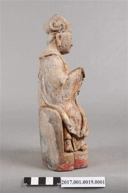 1.本件木雕天官大帝像,為三官大帝之一,採坐姿造形,外表彩繪粧佛部分脫落,鬍鬚脫落,背後有一長橢圓形入神洞,封榫尚存。天官大帝坐於臺座上,下方臺座呈前方後圓弧狀,底部平整。臉呈方圓形,長耳,相貌莊嚴,頭戴通天冠,冠前有帽徽裝飾,身著交領寬袖袍服,外罩披肩,袍服上有裝飾圖紋,胸前掛有「方心曲領」,腰束玉帶,雙手交握於胸前,手掌藏於方巾內,作持笏狀,笏板缺損,露出插孔。天官大帝端坐,腰前瘦長蔽膝垂地,腳著朝鞋,踩於方形臺座。