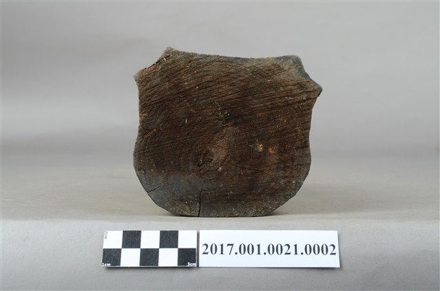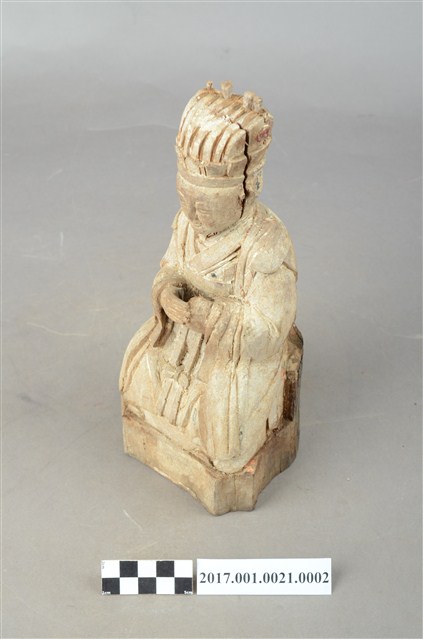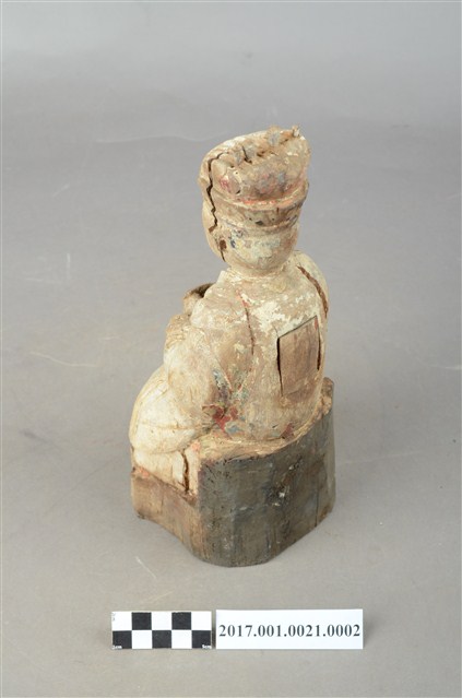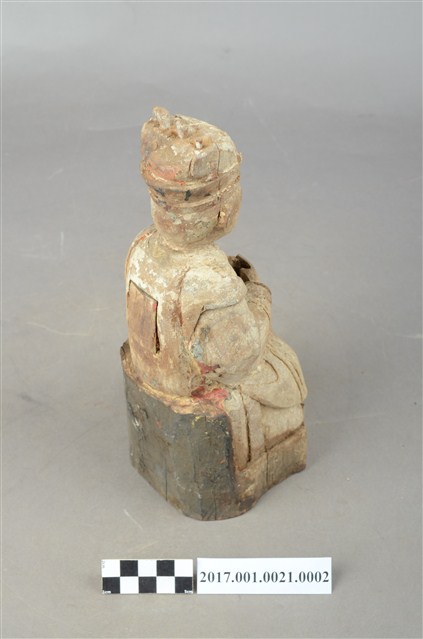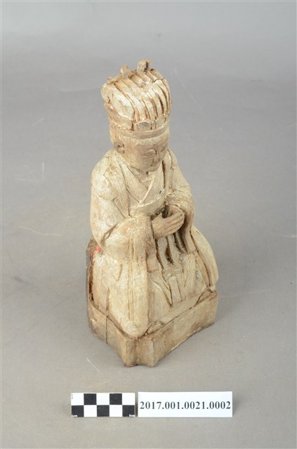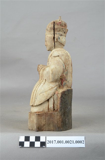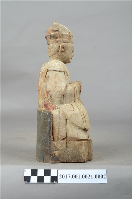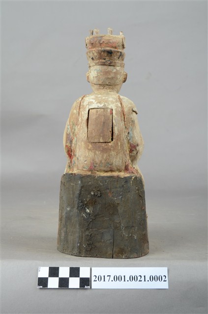 1.本件木雕地官大帝像,為三官大帝之一,採坐姿造形,粧佛已褪去,地官兩肩背後,有兩道縱裂紋,背部有一長方形入神洞,封榫尚存。地官坐於無背的臺座上,臺座背後呈方圓形,底部平整,前端略呈梯形。臉呈圓形,相貌莊嚴斯文,頭戴通天冠,冠頂有幾個凸點裝飾,部分缺損。身著斜襟寬袖袍服,外罩披肩,裙裳頂端繫於胸前,中央有綬帶打蝴蝶結垂於裳襬下緣。雙手交握於胸前,右手在前,作持笏狀,右手與袖緣間有一縱裂紋。腳著朝鞋,踩於臺座上。