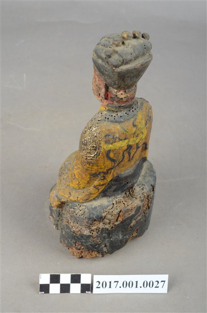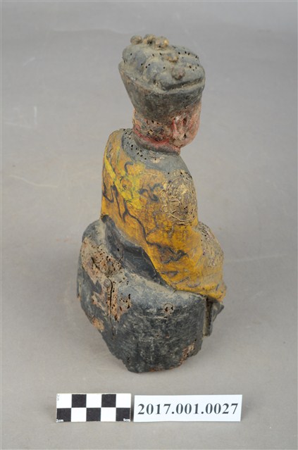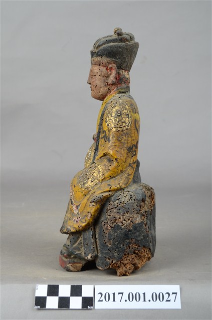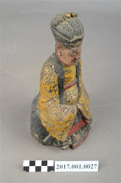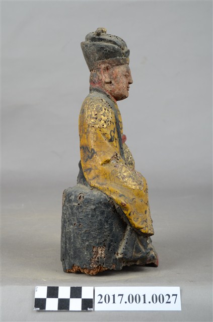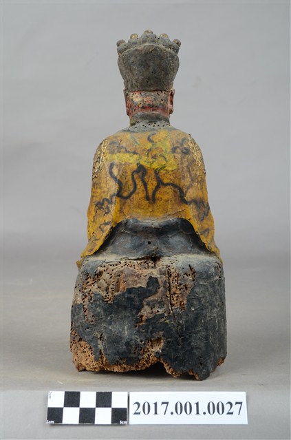 1.本件木雕天官大帝像,採坐姿造形,外表有局部安金、漆黃、紅、綠、黑色等彩繪粧佛,鮮豔色彩部分應為後人所添加,身上、冠上蛀蝕嚴重,佈有許多蛀孔。天官大帝端坐於無背圓形臺座,底部蛀蝕嚴重。臉呈方圓形,相貌莊嚴,頭戴梁冠,冠緣右側有V字形裂紋,臉上鬚髯已斷,留有安裝鬍子之洞。身著圓領寬袖袍服,外罩黃色披肩,袍服上有漆線圖紋裝飾,胸前有看帶,腰束腰帶,裳裙為黑色,中間垂有綠色蔽膝。雙手交握於腹前,雙手藏於衣袖內。腳著朝鞋,踩於一紅色踏几上,踏几右隅缺損。