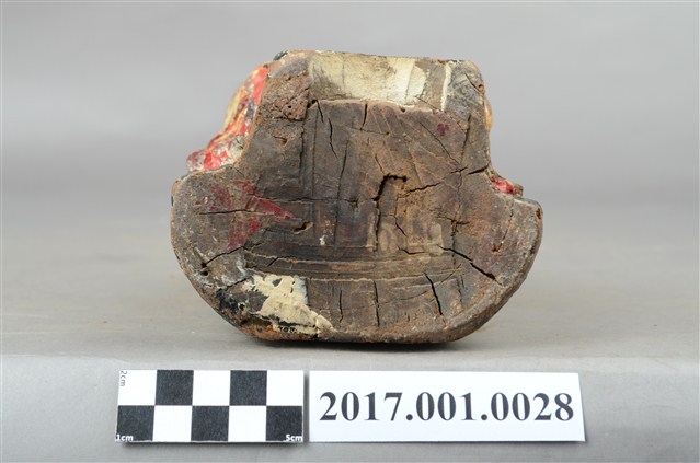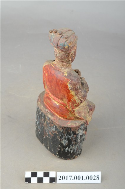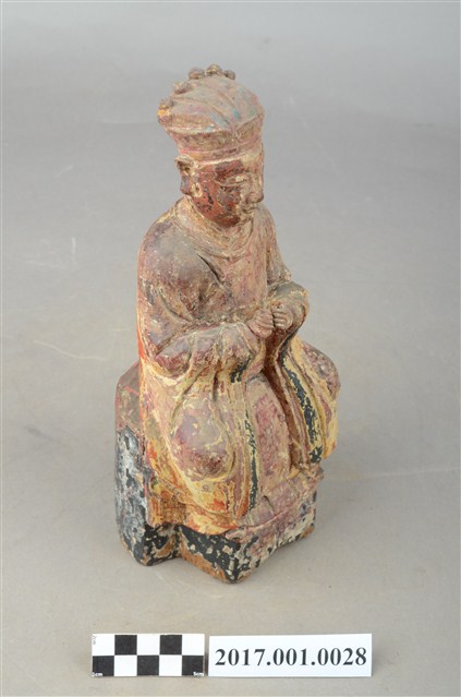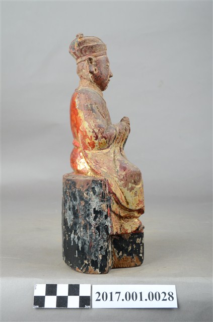 1.本件木雕天官大帝像採坐姿,端坐於圓臺之上,表面粧佛大面積斑駁脫落,鬍鬚脫落,背面袍服朱紅色漆及座椅黑色漆保存完好,手指一道縱裂紋。天官像作中年男子相貌,朱紅色臉,兩眼及鼻、嘴周圍漆面脫落,鼻下兩端及下頷鑽有小孔作為植鬚處,頭戴忠靖冠,身著圓領寬袖袍服,頸部掛「方心曲領」掛飾,雙手小臂向內上舉,左手掌在外兩手交握作持笏狀,手中笏板已失,雙足踏於座前踏几上,雙腿隱於裙內,僅露出鞋尖。