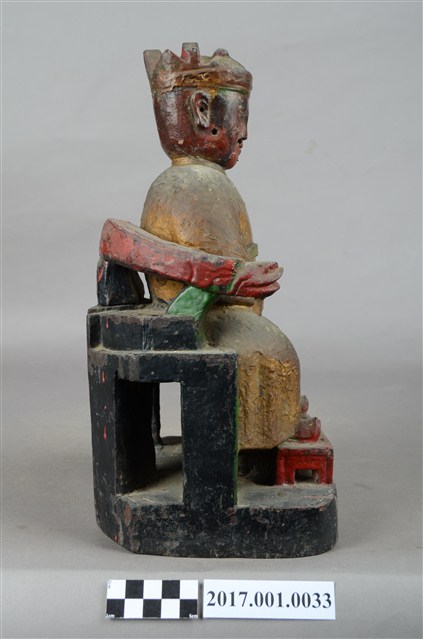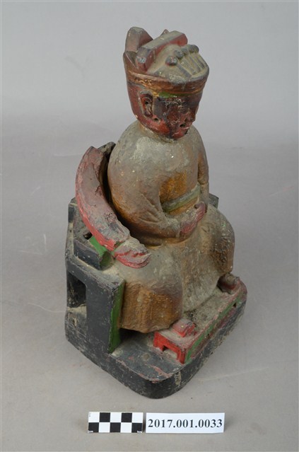 1.本件木雕地官大帝像採坐姿,外表有彩繪粧佛,表面佈滿污漬。地官端坐於圈背椅上,左側扶手缺損。臉形方圓,相貌莊嚴,上有紅漆,鬍子已脫落,露出安裝鬍子之洞口。頭戴梁冠,身著圓領窄袖袍服,雙手交握於腹前,右手掌在前,胸前有看帶。腳著朝鞋,下有雙層方形臺座,上窄下寬,上層為方形小踏几。