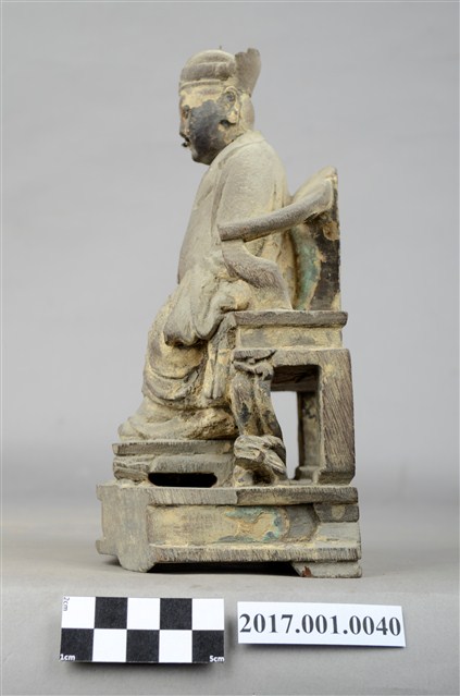 1.本件木雕水官大帝像,採坐姿造形,端坐於圈背椅上,粧佛已除去,露出底色木紋,右邊扶手及左邊扶手出頭缺損。臉呈方圓形,相貌莊嚴,眉目清晰,臉上鬍髯已斷裂。頭戴忠靖冠,冠前有圖紋裝飾。身著圓領袍服,外罩對襟寬袖長衫,腰束腰帶。左手垂下安放於左膝上,手掌磨損,右手曲肘微抬於右胸側,手掌缺損。腳著朝鞋,底下有兩層方形臺座,呈上小下大,上層為方形踏几,下層為方形臺座,其中一角略有缺損,水官踏於上層方形踏几,几腳雕有獅吞。
