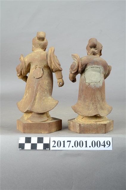 1.本件為陳、林、李三位三奶夫人中的兩位女神,應與主神陳靖姑成三像一組形式,以木雕方式製作,表面粧佛已脫落,兩像皆站於一六角形臺座上。林奶夫人背後有一方形入神洞,以泥封榫,李奶夫人背後有一圓形的入神洞,為木封榫,裡面入神物已失。本組兩位女神,分別為一左一右的林奶夫人和李奶夫人,林奶夫人應站於陳靖姑的身左(龍邊),李奶夫人應站於陳靖姑的身右(虎邊)。林、李夫人兩像皆作鵝蛋臉,面相娟秀。頭梳圓髻與護眉,著束袖長袍、長裙,外罩對襟寬袖罩衫,罩衫下襬向上揚起,以示英武之姿。林奶夫人右手橫於胸前,手掌虛握,持物已失,左手手肘微彎,手掌虛握,持物也佚失。李奶夫人左手微彎,握拳似捏一物,右手虛握,持物已失。