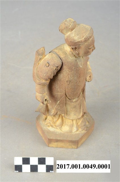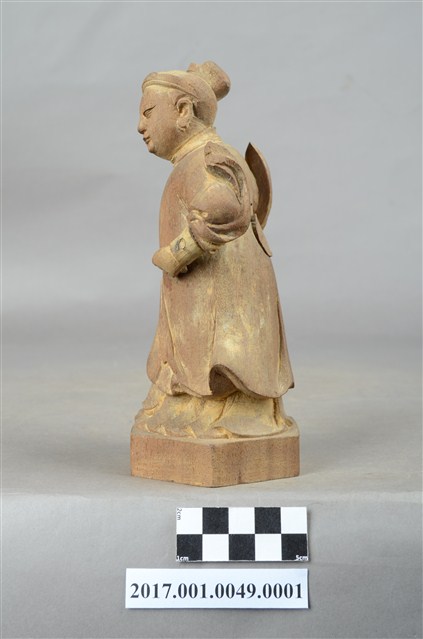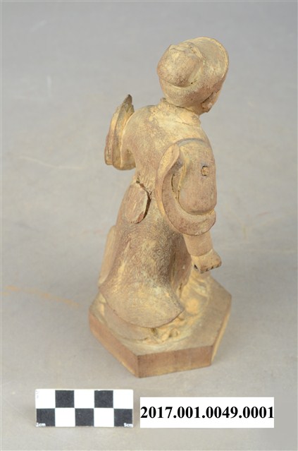 1.本件立姿林奶夫人像,與另一位李奶夫人,為主神大奶夫人陳靖姑的兩位結拜姊妹,三像一組形式供奉,以木雕方式製作,表面粧佛已脫落。本件林奶夫人站於一六角形木座上,應站於主神的身左,即龍邊。林奶夫人臉呈鵝蛋臉,臉孔娟秀。頭梳圓髻與護眉,著束袖長袍、長裙,外罩寬袖罩衫,袖口下襬向上揚起,以示英武之姿。林奶夫人右手橫於胸前,手掌虛握,持物已失,左手手肘微彎,手掌虛握,持物也佚失。背部有方形入神洞,泥封榫仍在。